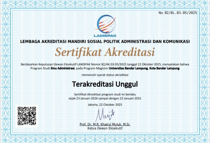 Berdasarkan Keputusan Dewan Eksekutif Lembaga Akreditasi Mandiri Sosial Politik Administrasi dan Komunikasi (LAMSPAK) Nomor 82/AK.03.05/2025 tanggal 22 Oktober 2025, Program Studi Magister Ilmu Administrasi pada Program Pascasarjana Universitas Bandar Lampung resmi meraih Akreditasi Unggul.